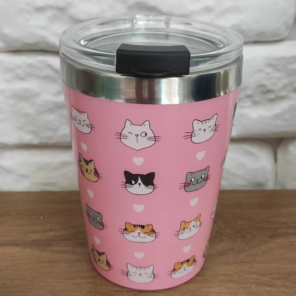 Ao segurar esse copo, você será cercado por um verdadeiro festival de fofura felina. Com gatinhos de todas as raças e cores estampados em um rosa vibrante, você vai se sentir como se estivesse rodeado de adoráveis companheiros de quatro patas.