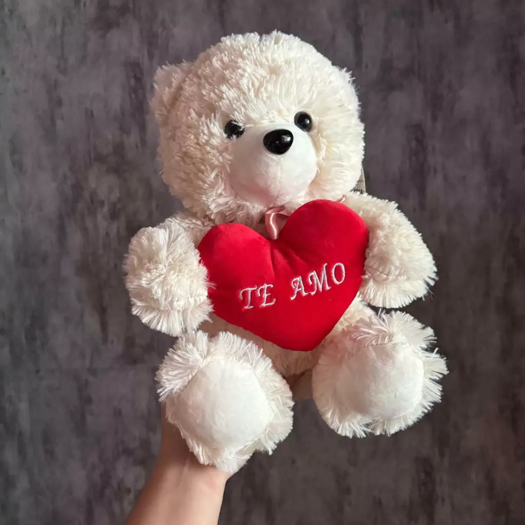Declare seu amor com este encantador urso de pelúcia branco, que segura um coração com a mensagem "Te Amo". Feito em poliéster macio e recheado com fibra de poliéster, oferece um toque suave e aconchegante. Com ênfase na segurança, é certificado por um órgão acreditado pela CGCRE do INMETRO. Um presente perfeito para momentos especiais e para expressar seus sentimentos com carinho!